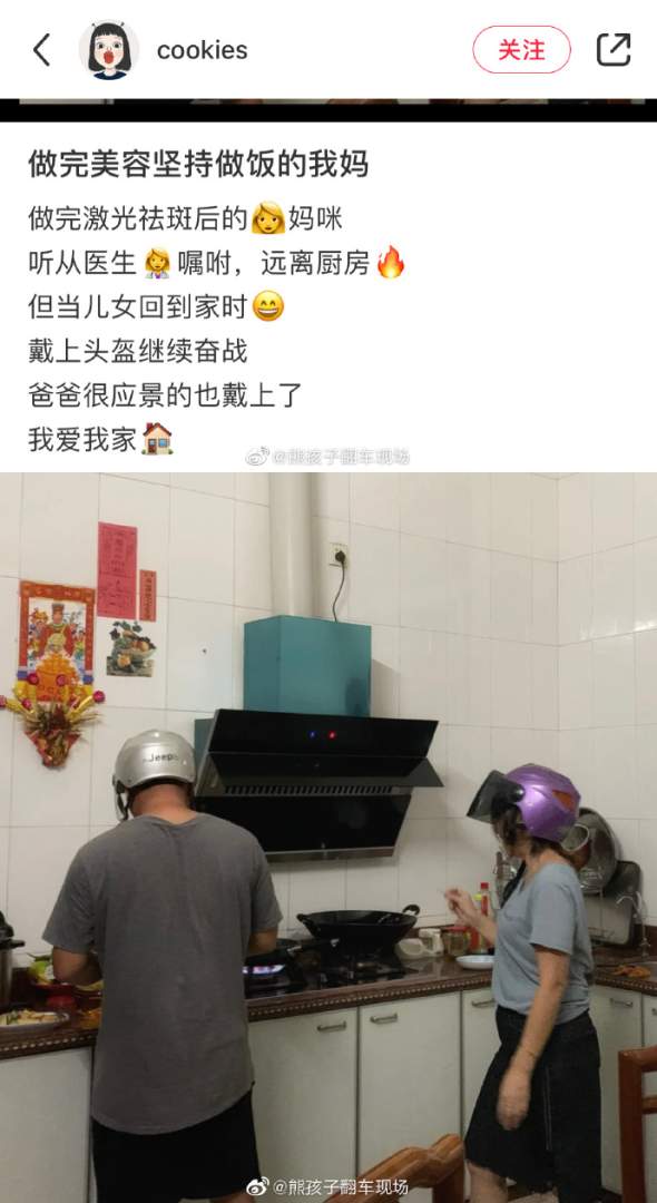 做完美容戴着头盔在饭的父母。