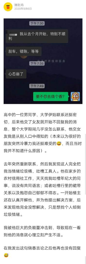 如何糊弄把你当情绪垃圾桶的人:建议您去烧个香。